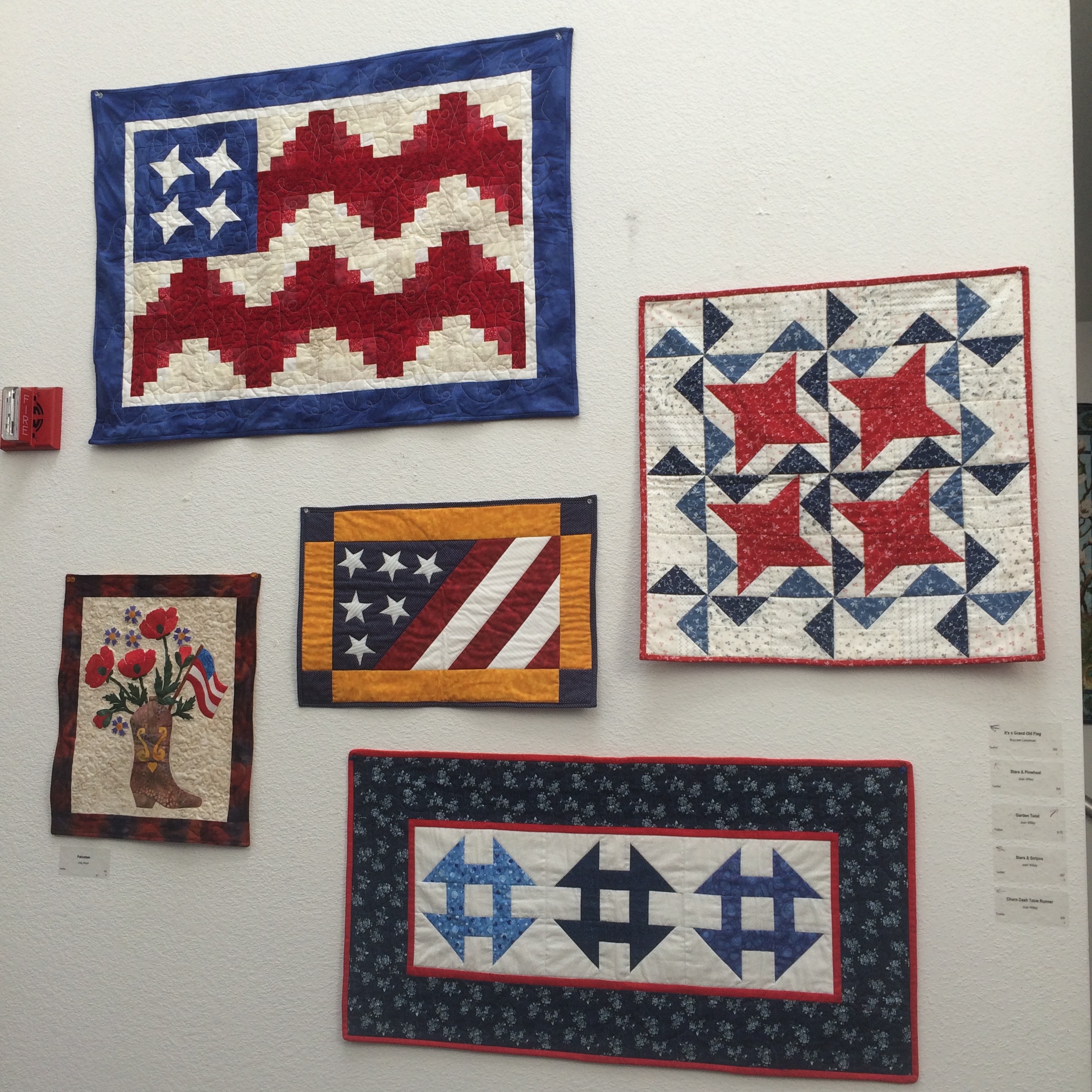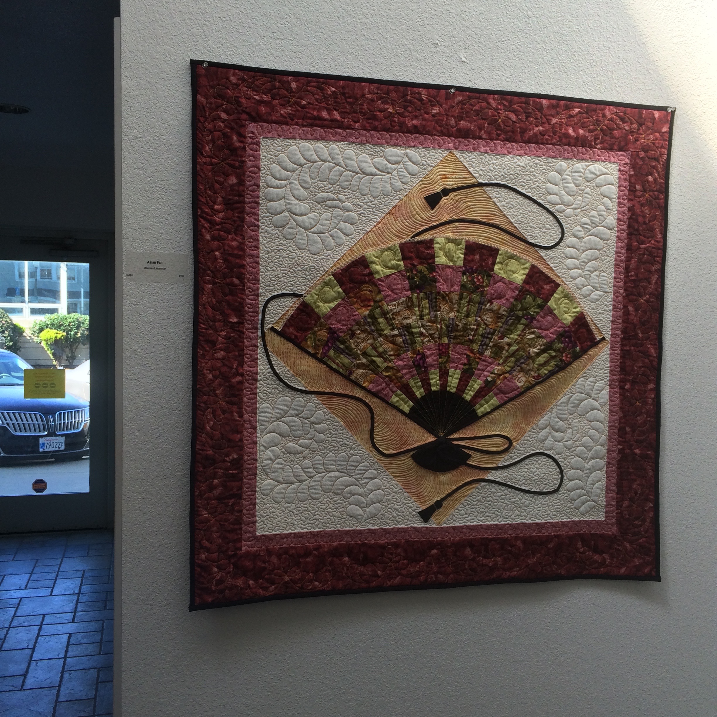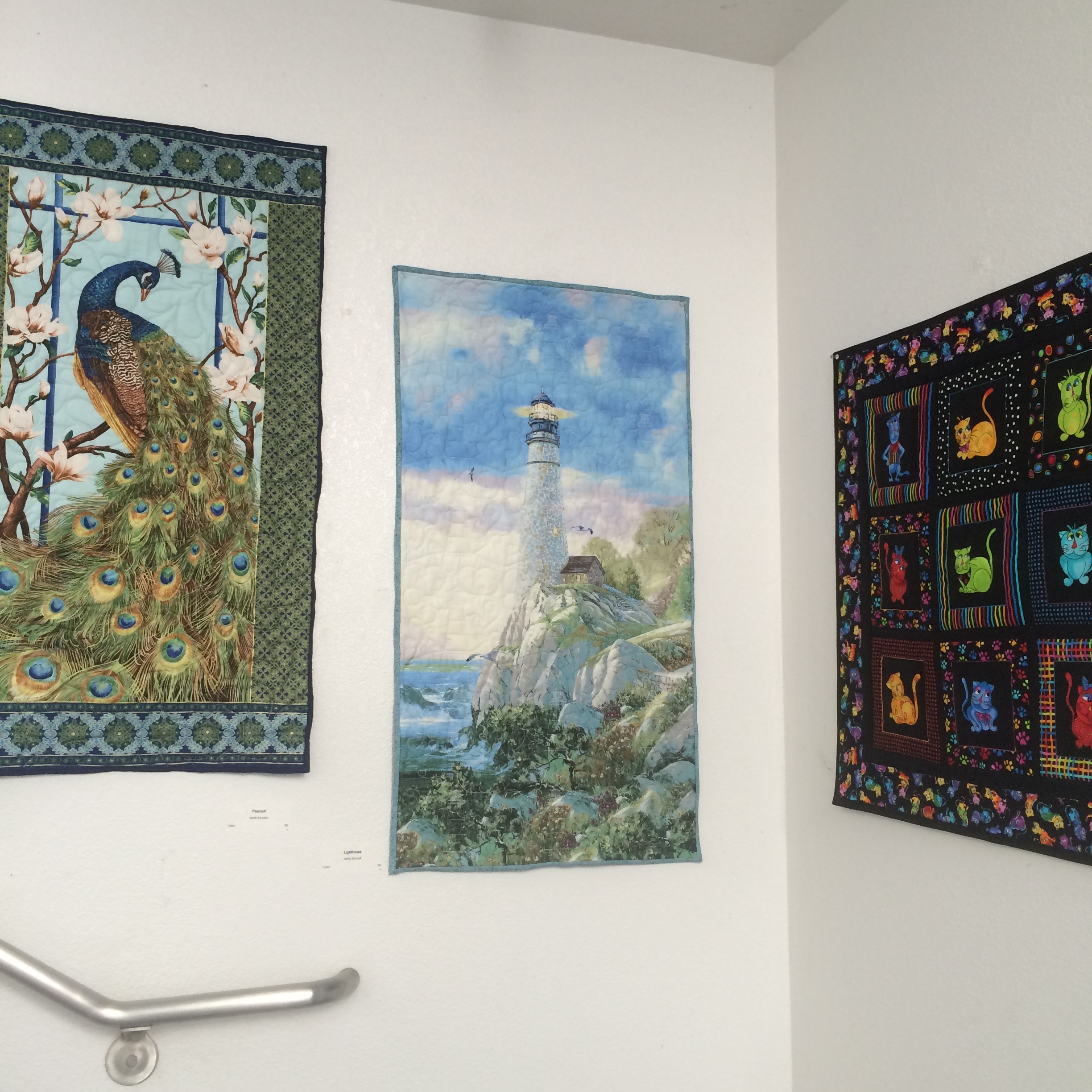 Wednesday I helped the Pacifica Art Connection take down the old show and hang a new one at the Quarry Cove Art Gallery. The show we took down was a really colorful one by the The Crafty Ladies (formerly known as The Coastal Quilters). Four of the women (Maureen Lieberman, Joan Willey, Jackie Samoluk, Judy Meyer) are quilters. Barbara Haeseler creates ceramics and Pat Lancaster’s talent is organizing their events. Here is a selection of some of the pieces that were on display.
