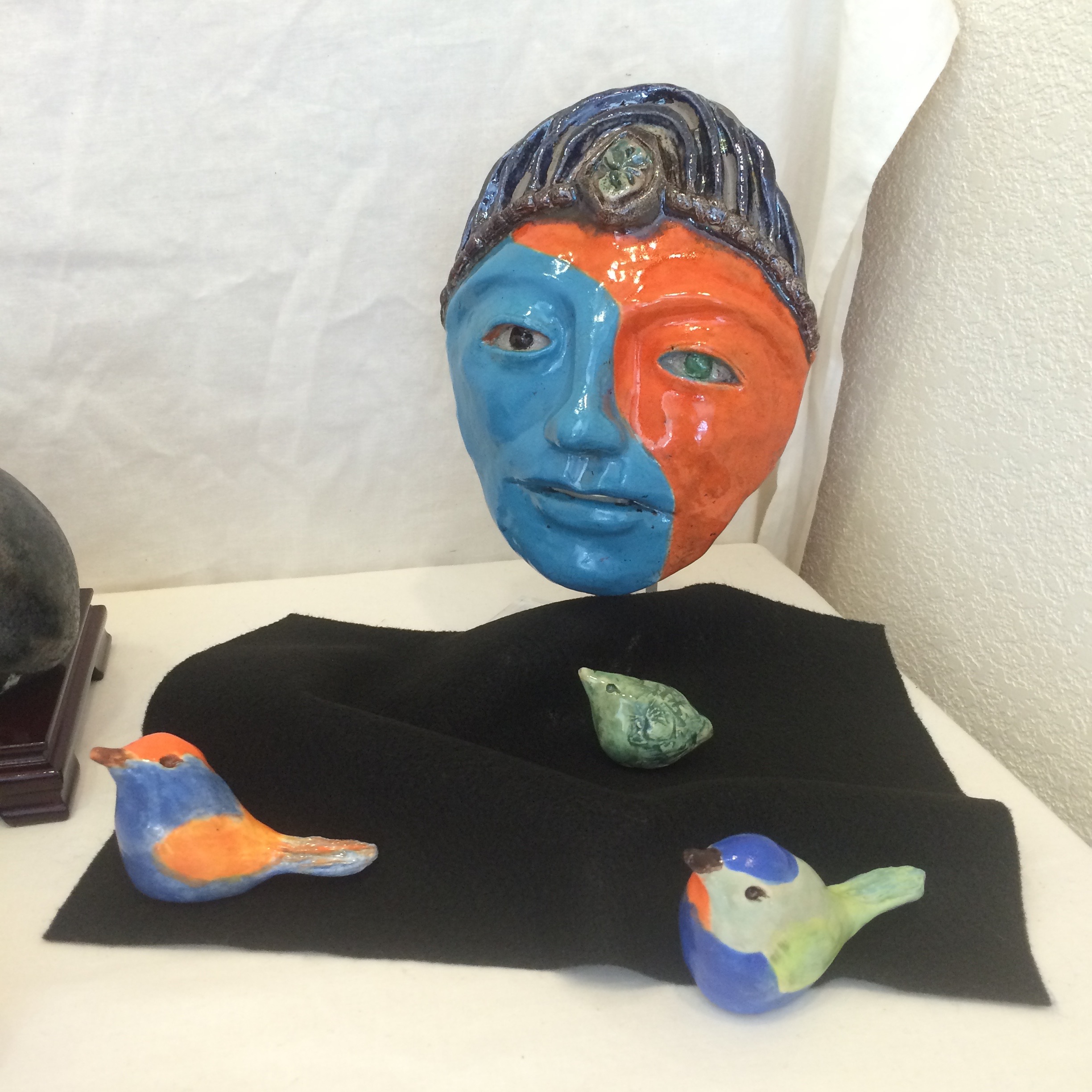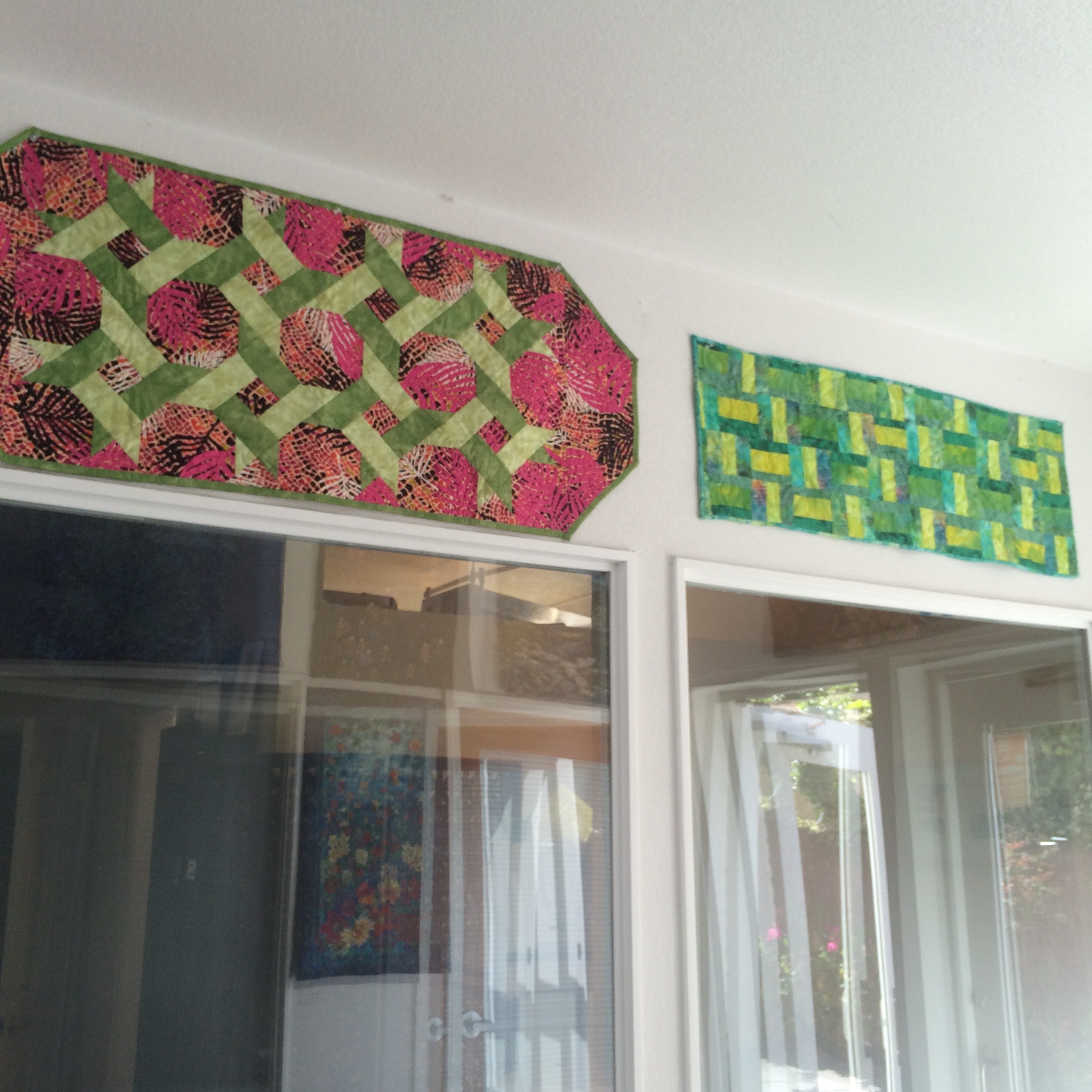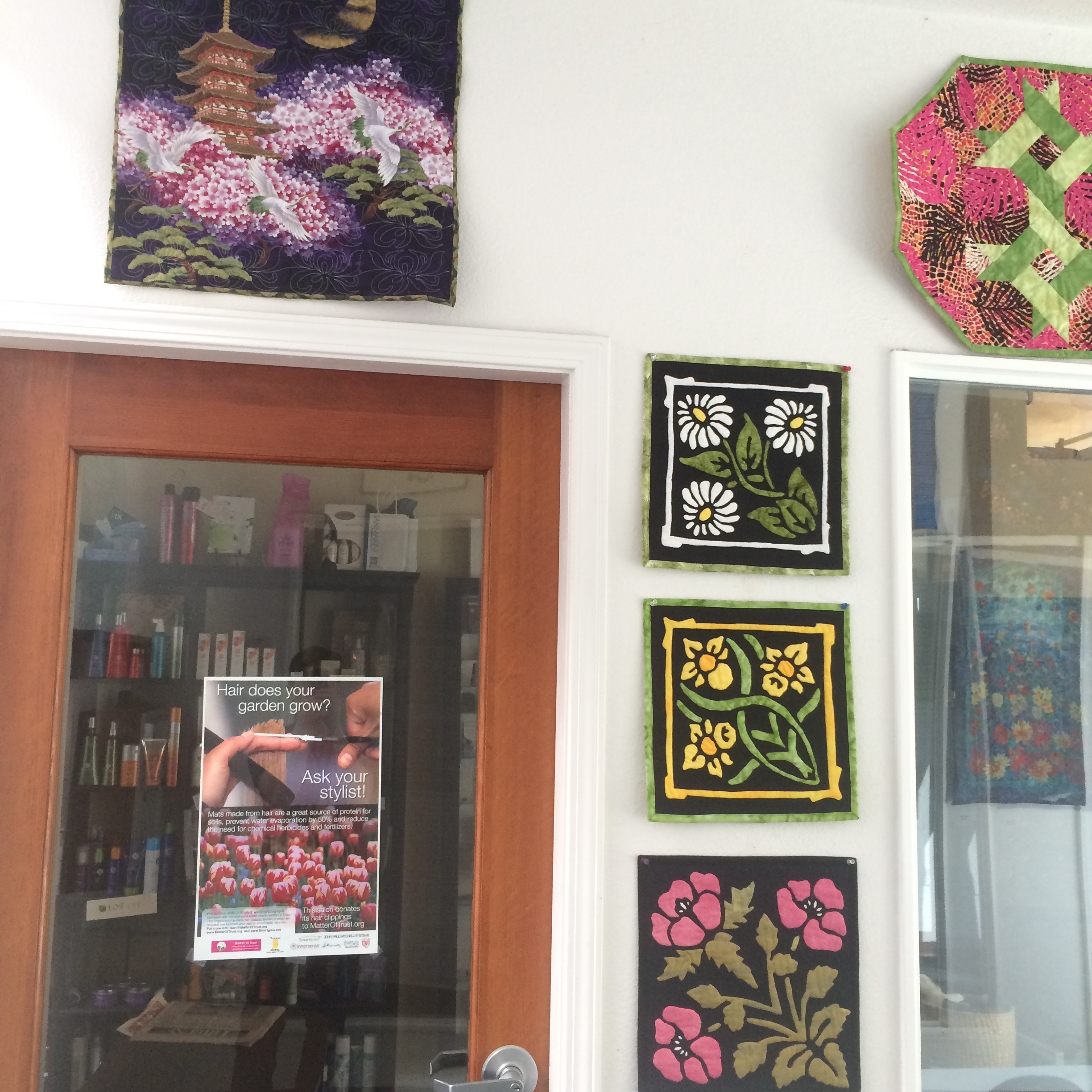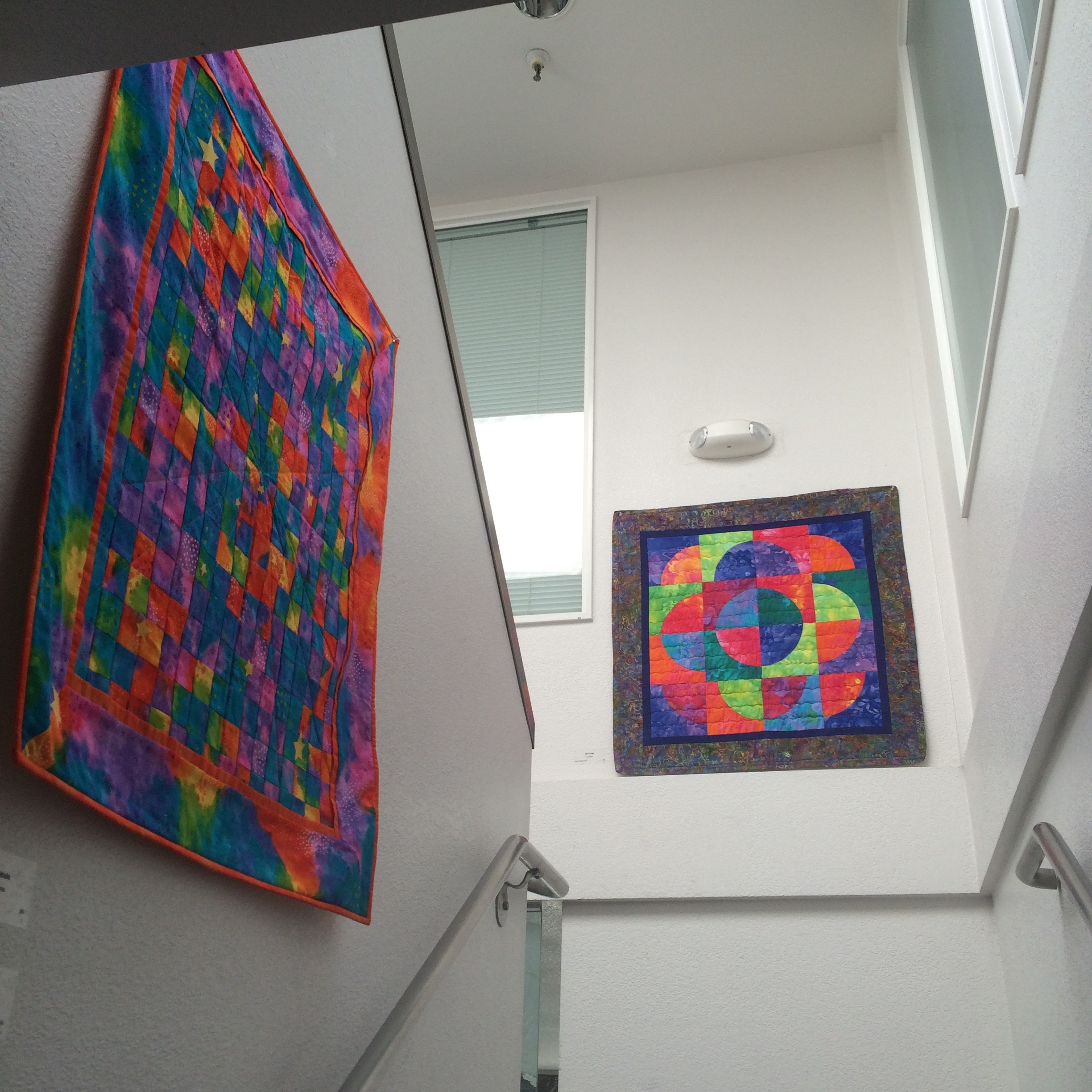 Wednesday I helped the Pacifica Art Connection take down the old show and hang a new one at the Quarry Cove Art Gallery. The show we took down was a really colorful one by the The Crafty Ladies (formerly known as The Coastal Quilters). Four of the women (Maureen Lieberman, Joan Willey, Jackie Samoluk, Judy Meyer) are quilters. Barbara Haeseler creates ceramics and Pat Lancaster’s talent is organizing their events. Here is a selection of some of the pieces that were on display.